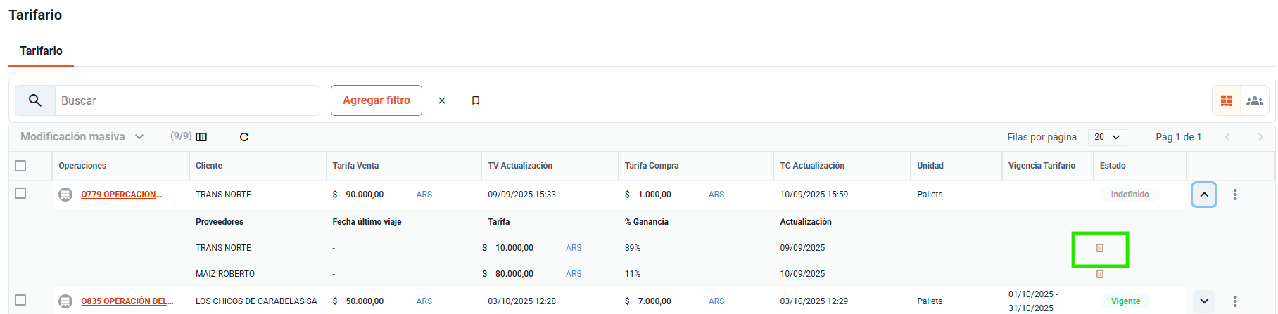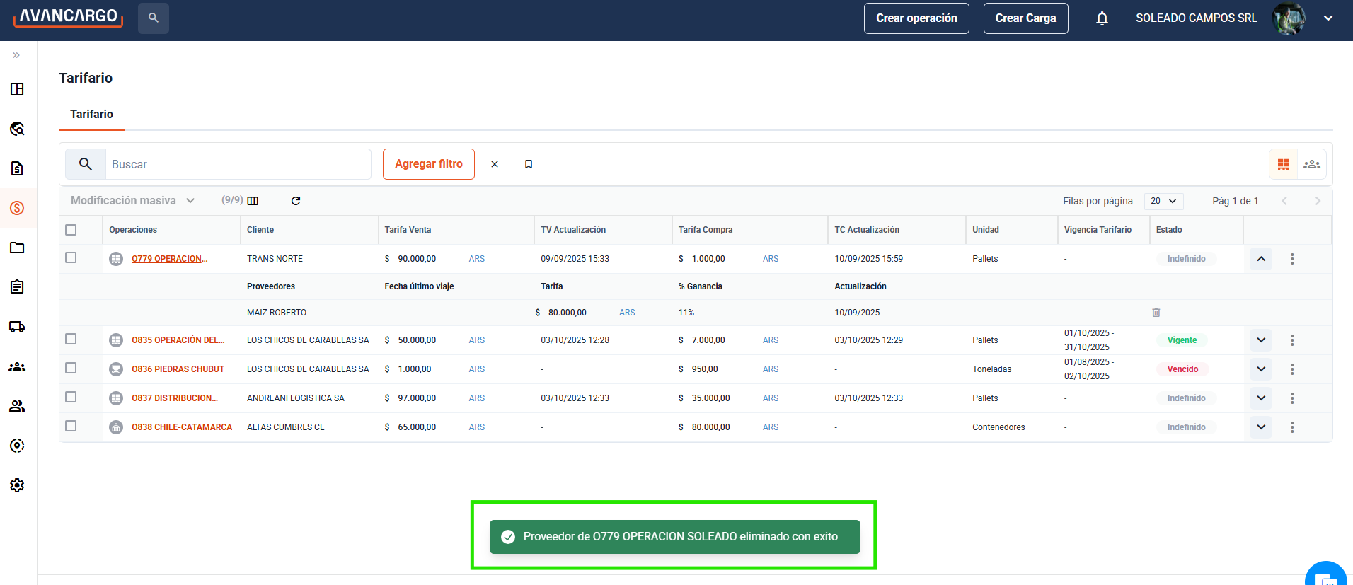 Haciendo clic en el nombre de la operación, accedes directamente a toda la información de la misma. La operación se abre en una nueva pestaña, lo que te permite consultar los detalles sin perder la vista actual del Módulo Tarifario.
