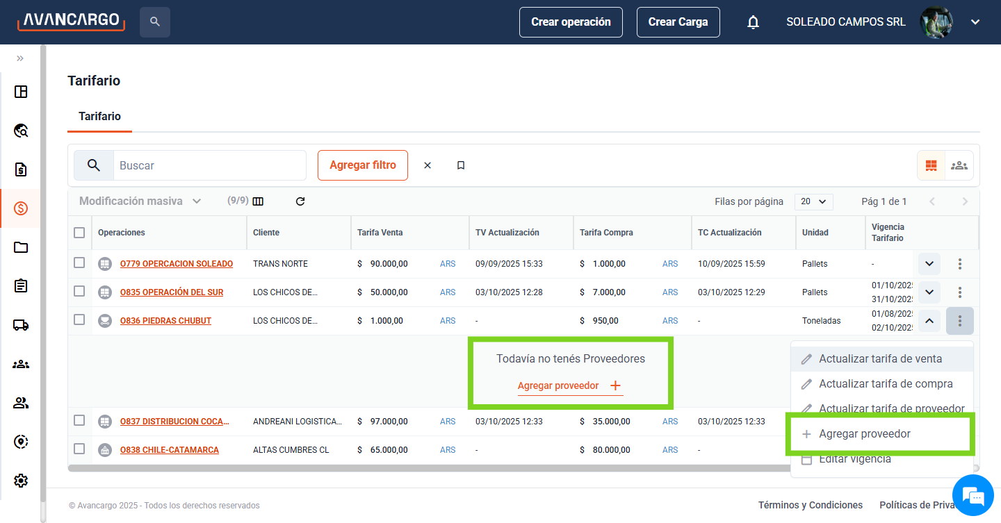 - Agregar a una operación: desde la Vista Operaciones, la opción “Agregar proveedor” abre un modal para sumar un proveedor a la operación.