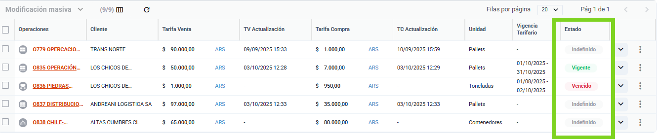 El estado indica la condición actual de la tarifa en la operación, en función de las fechas de vigencia:
