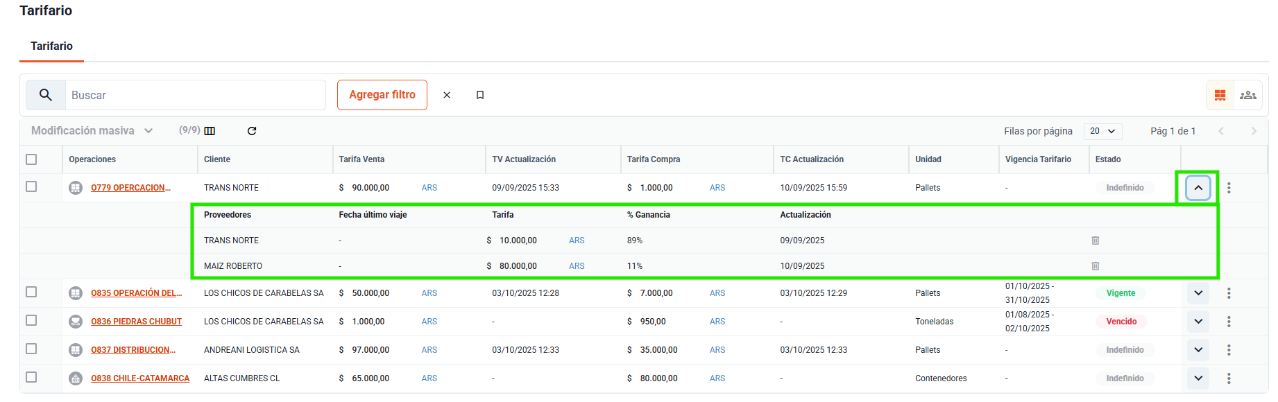Al desplegar la información de una operación nos encontramos con una lista de todos los proveedores asociados a esa operación. Puedes ver la tarifa a pagar a cada proveedor y el margen de ganancia en relación a la tarifa de venta.