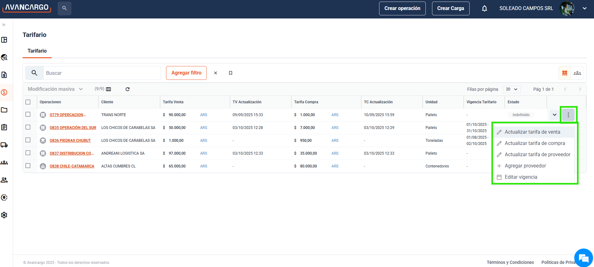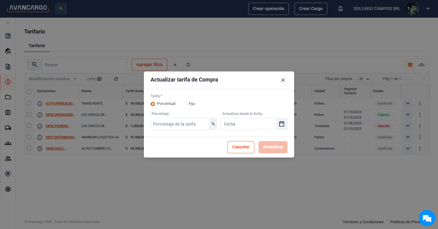 Crear Operación Accede a la plataforma Avancargo y haz clic en el botón "Crear operación" en la barra superior: Selecciona "Operación propia" u “Operación de un cliente” según corresponda. Si avanzas con “Operación de un cliente”, debes elegir uno de ...