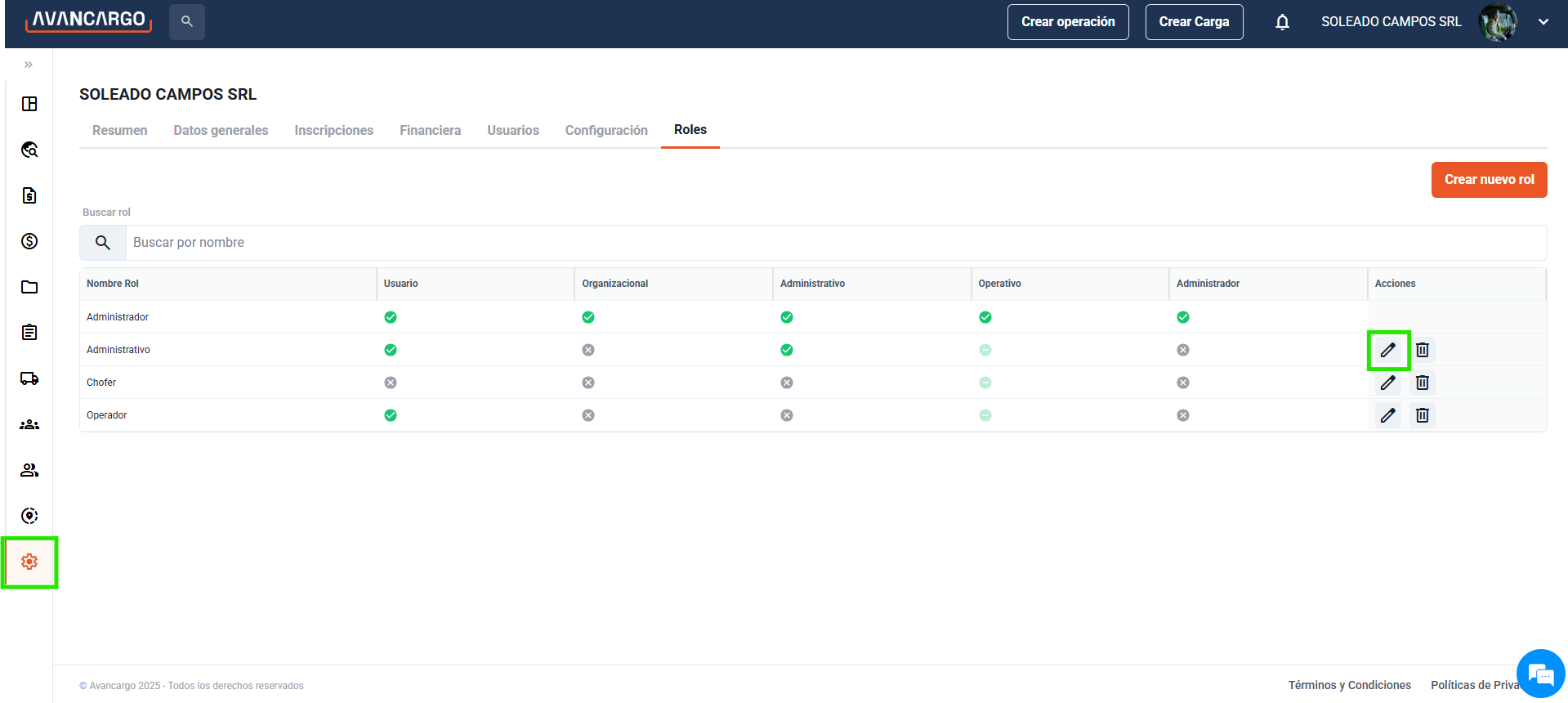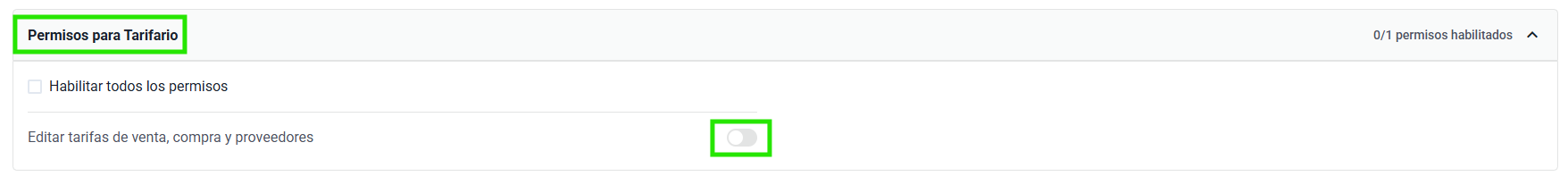 La edición de tarifarios se controla desde la gestión de roles mediante el permiso “Permiso para editar tarifario”.